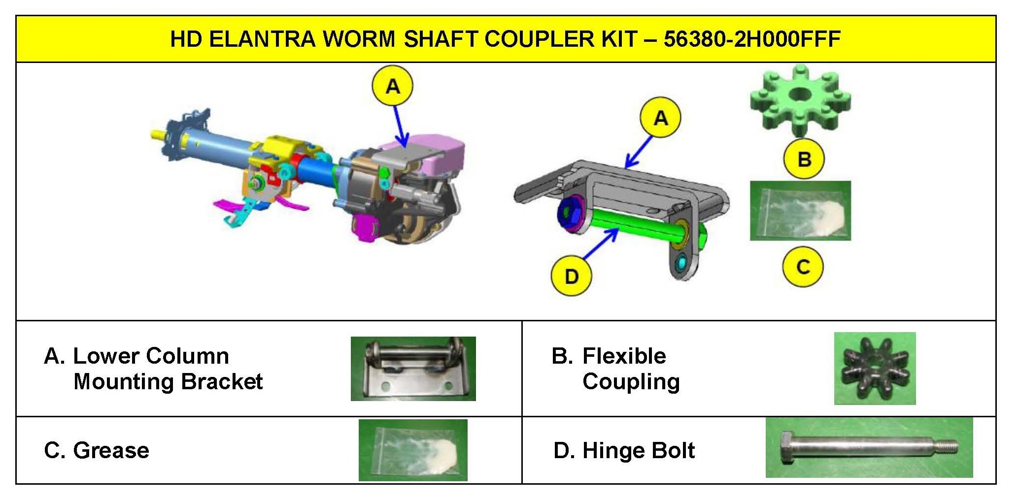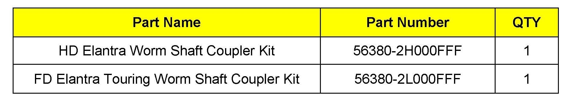OFP: 56310-2H301 (Qty. 0) Description:Elantra Steering Flexible Coupling Replacement Consequential:56380-2H000FFF (Qty. 1) OP Code: 56380F00 T1: N29 (Abnormal Noise) T2: C24 (Improper Clearance) LTS: 1.3 M/H