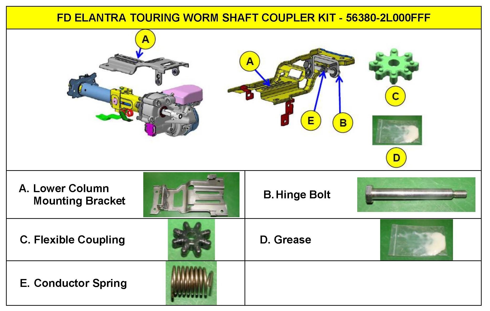 OFP: 56310-2L300 Qty. 0) Description:Elantra Touring Steering Flexible Coupling Replacement Consequential:56380-2L000FFF (Qty. 1) OP Code: 56380F00 T1: N29 (Abnormal Noise) T2: C24 (Improper Clearance) LTS: 1.3 M/H
