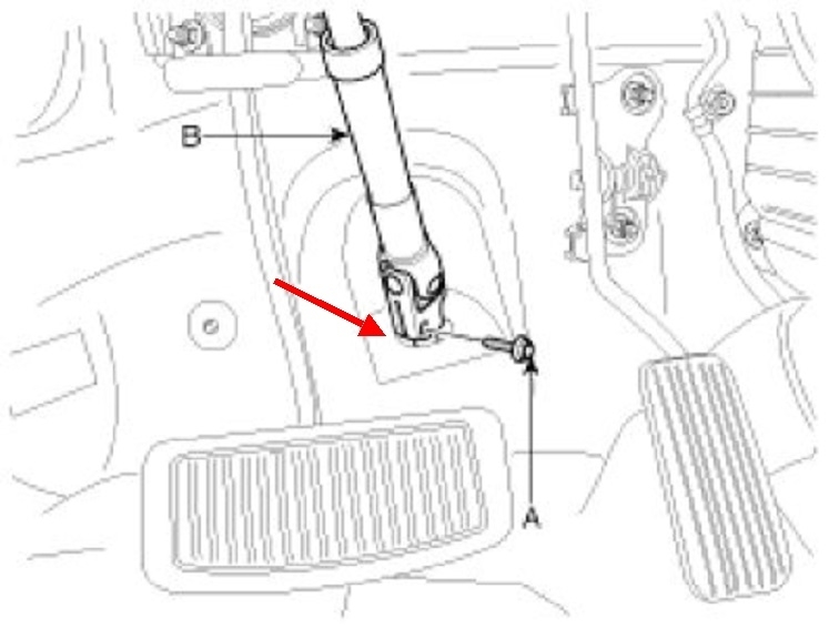 They don't show a dust boot on this drawing. My red arrow is pointing to the seal that needs the grease. You'll see it under the dash on the firewall. As an alternative, you can spray some Silicone Spray Lube on the seal. That will work its way in without bothering with pulling the lip of the seal back. This stuff goes on like water. It leaves a film of "slippery" behind when it evaporates. The disadvantage is this doesn't last as long as regular grease. You may have to reapply it a few times per year.