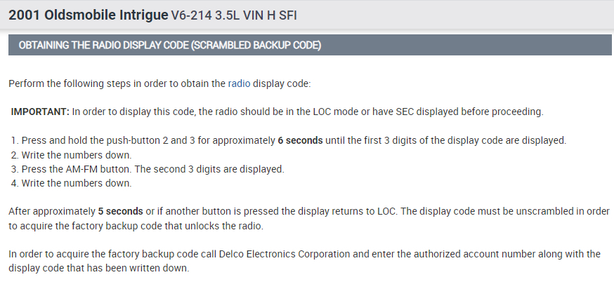 Now if you know a GM dealer code you can call 1-800-537-5140 and use that code plus the radio numbers to get the correct unlock code by following the instructions on the phone.
