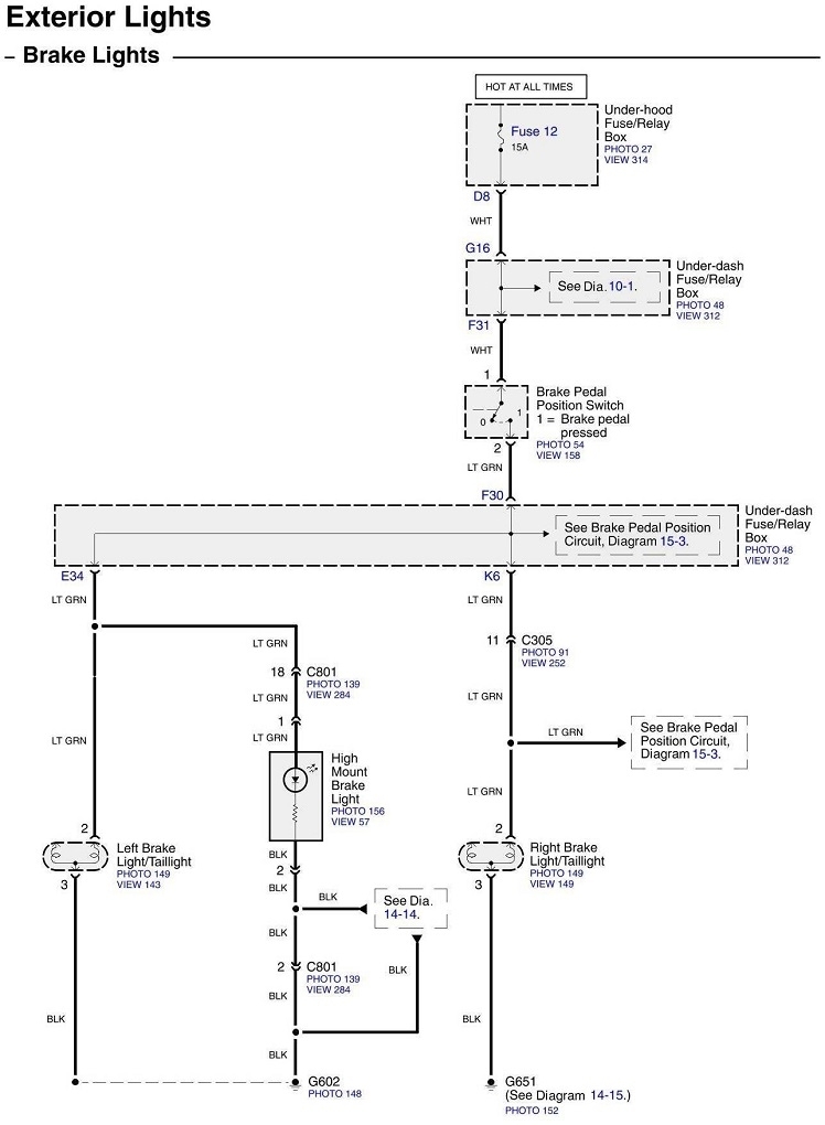 Dandy. I don't see a connector to isolate the left brake light. The right one goes through connector C305. Unplug that one if you can find it. Those wires are fixed and not likely to flex or break. Where I would start next is to open the lift gate, then see if a new fuse blows. If it doesn't, suspect the wires between the hinges.