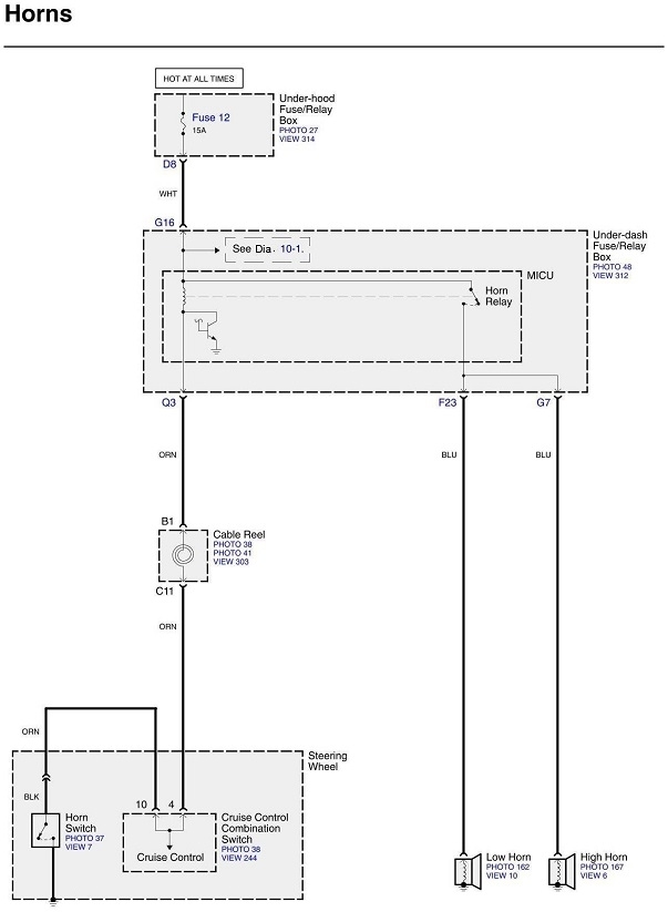 If the horn works properly and the fuse doesn't blow at this time, since we can't unplug the horn relay, we could unplug both horns under the hood. If fuse 12 still blows some time later, we can eliminate the horns as the cause.
