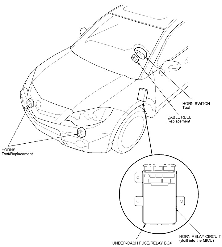 I'm sorry that I made this sound so complicated. The procedure is actually very easy and takes less than a minute for each step, but I included as much detail as possible to avoid any confusion. The hardest part might be simply finding the horns and getting to them. The first drawing shows where they are, but I can't tell if you can reach them from up on top or if you have to crawl under the front of the car.