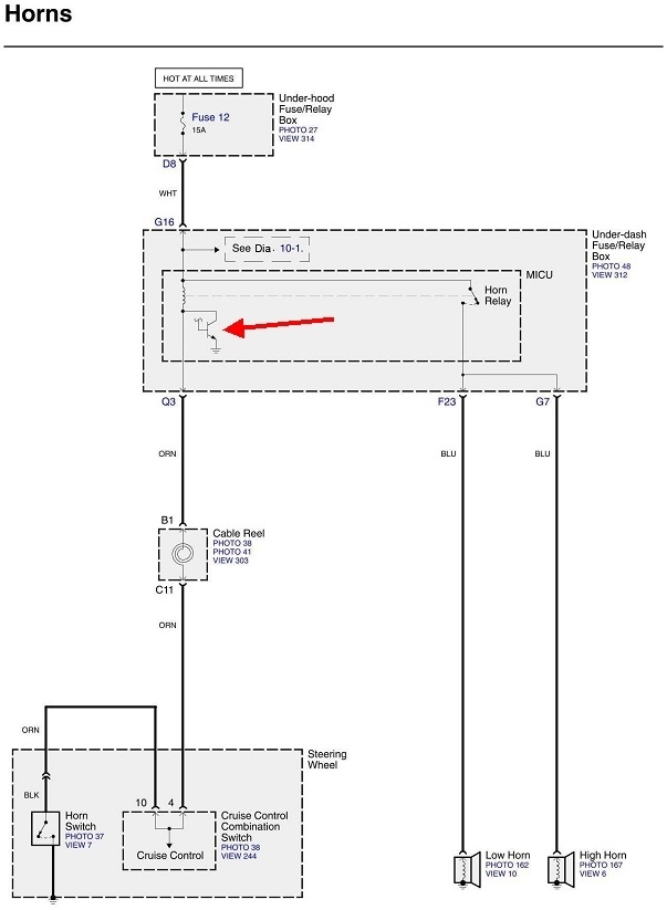I gotta stop here as I found I made a mistake. It appears the horn relay is built into the under-dash fuse box and can't be removed. In the second diagram, my red arrow is pointing to a switching transistor which supports my belief the horn can be programmed to chirp when the doors are locked. The horn relay can be turned on by two means. One is with the horn button on the steering wheel and the other is through the computer circuitry, (theft alarm system).