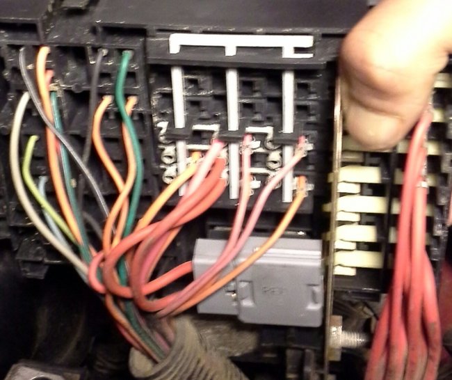This is the backside of the fuse/relay center beneath the hood. The bulky gray plastic two wire connector at the bottom that has the two orange wires connecting fifty amp Maxi-fuses to the top and middle row sets of twenty amp fuses, does that belong there or is it doubling up on twelve volt current? Should it be removed? I have never seen or heard of its presence in any troubleshooting or schematics. I had to flip the box to snap the picture so the layout is inverted. When I connect the battery the guage cluster and interioir lights are on, full time, key on off position. But when I pull the horn fuse and only the horn fuse the parasitic drain drops from seven amps to .7amps. Your help is greatly appreciated!