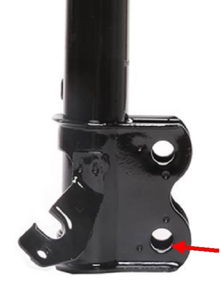 My recommendation, to avoid all these potential problems, is to install a pair of quick struts. I used the Rock Auto site for these photos, but most local auto parts stores and even farm and home stores have them. Given there's no need to pay someone to install them, these assemblies cost a lot less than when buying the individual parts. You may have to fight with the broken side to get the pieces out, but the other side is a simple bolt-in job. The car will need to be aligned afterward. GM cars come with the lower strut mounting bolt holes as shown in the second photo. On Most older Chrysler products, the lower hole, (red arrow), is oval-shaped to allow camber to be adjusted. Many aftermarket struts for GM cars come this way too, but if not, if camber needs to be adjusted during the alignment, the mechanic will grind one of the holes into an oval, then install a special bolt with an offset head that helps hold it in position so it doesn't shift when you hit pot holes. If the holes aren't slotted on your new struts, installing them that way will get camber close enough to allow you to drive to the alignment shop.