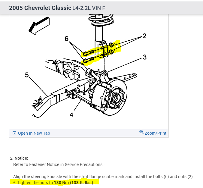 Be aware the vehicle needs to be aligned when replacing struts. With this very common front strut design, one of the main adjustments is done at the lower of the two strut mounting holes. On Chrysler products, those lower holes are elongated to allow for that adjustment. With GM original struts, those holes must be ground out to allow the adjustments to be made. Some aftermarket replacements come with the holes already elongated. When they are not, your alignment specialist will have to disassemble them to do that procedure. When you install the new struts yourself, there may be an extra charge to take them apart again. If you grind the holes yourself, I recommend you wear disposable gloves due the miserable metal filings that will get stuck in your skin. Be sure to wear eye protection too.