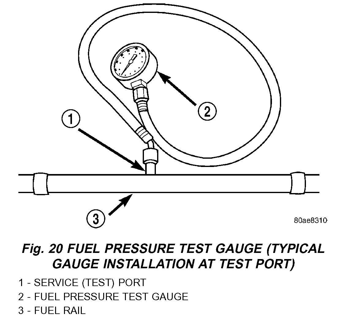 1. Remove protective cap at fuel rail test port. Connect the 0 - 414 kPa (0 - 60 psi) fuel pressure gauge (from gauge set 5069) to test port pressure fitting on fuel rail. The DRB III Scan Tool along with the PEP module, the 500 psi pressure transducer, and the transducer-to-test port adapter may also be used in place of the fuel pressure gauge.