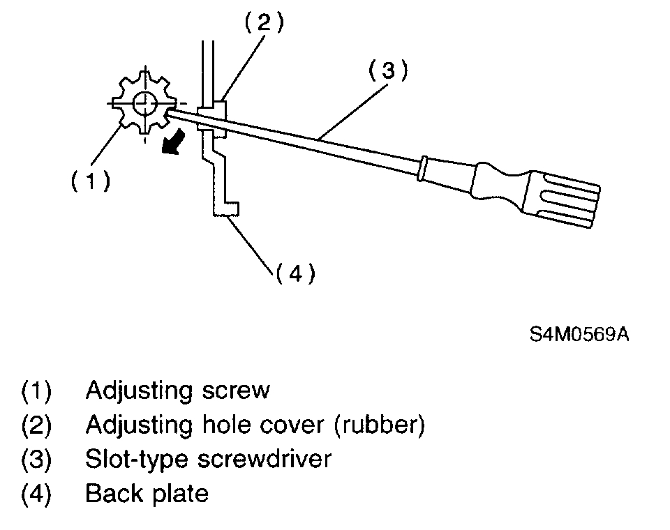 1. Turn adjusting screw using a slot-type screwdriver until brake shoe gets away enough from the disc rotor.