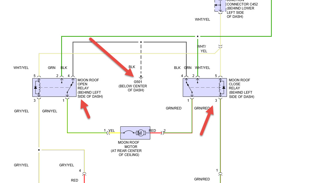 check ground marked in picture then check to see if gray/yellow wire is sending power to relay. could be switch or relays or a bad motor.