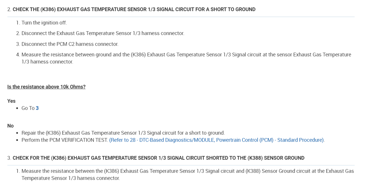 There are four Exhaust Gas Temperature Sensors (#1, #2, Catalyst, and #3) used by the Powertrain Control Module (PCM) to monitor engine exhaust temperatures in the aftertreatment system. These 2-wire/5-Volt sensors are thermistors and change resistance based on the temperature being measured. When the exhaust gas temperature is cold, the sensor thermistor resistance is high. When the exhaust gas temperature is hot, the sensor thermistor resistance is low. Exhaust Gas Temperature Sensor 1/3 is located at the inlet of the Selective Catalytic Reduction (SCR) Catalyst. It sends a signal to the PCM indicating the temperature of the exhaust gases entering the SCR. This is a 2-trip fault. The PCM illuminates the MIL lamp immediately when the diagnostic runs and fails. The PCM also disables active regeneration mode. The PCM will turn off the MIL lamp after the diagnostic runs and passes on four consecutive drive cycles.