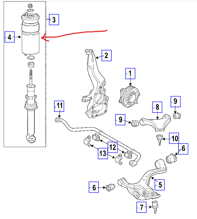 It is common for the air shock suspension to have a lean at the air shock itself, to confirm the leakage you can use a spray bottle of soapy water and spray it around the sock to see if there are bubbles confirming the failure, here are diagrams of the system and how to change the air shock out and depressurize the system. Check out the images (below). Please let us know what happens.