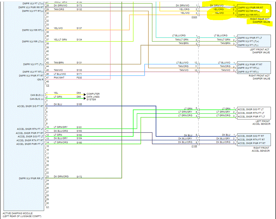I attached the entire wiring schematic below for the electronic suspension. I highlighted the right rear.