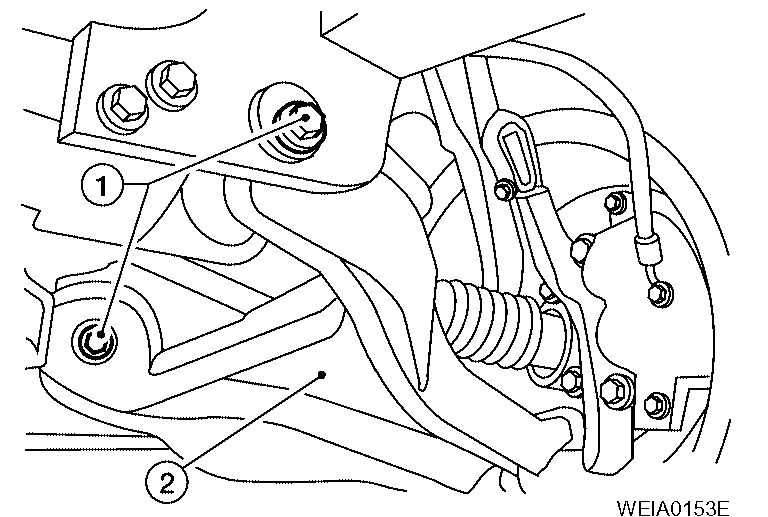 6. Remove lower link cam bolts (1) and nuts, then the lower link (2).