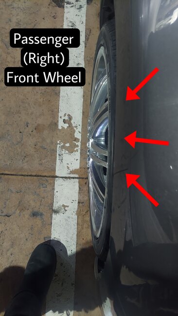 My boyfriend hit a middle divider and I can't figure out what exactly is wrong with the car now. I first noticed the driver's side front tire was pushed back more than all the other tires so when I turned the steering wheel the tire would hit the wheel well and my car wouldn't be able to turn all the way. I was told it was my A-arm/control arm. So, I bought a brand new one and put it on my car. It seemed to have fixed the problem, but I wasn't convinced. To me it was still slightly pushed back. I was able to turn the car fine but when the steering was turned all the way I could still feel and hear the tire scraping on the inside wheel well. So, the first time I drove it since putting a new a-arm on it did ok but to me it didn't feel right. Well on my way home I'm on the freeway and I hear a loud noise and than a loud thumping noise, so I pull over thinking I have a flat tire and I don't... I don't see anything wrong so I try driving and it makes a really loud thump thump, thump, noise and it doesn't feel like everything is okay so I pull into a gas station and look under my car and all around and I find that the back side of the tire has been totally shredded with all the metals showing but we're still holding air. So, I looked at my trunk I didn't have a spare tire my boyfriend comes, and he goes to change the tire when he takes the tire off we see behind the tire there's a whole bunch of oil everywhere as if something exploded. So, I get it to a back to my house and everybody's telling me now that it's my struts front and back because my car is leaning to the left. But what I noticed it the front and back tires on the driver's side don't seem to line up with the body of the car but on the right side they do... I'll attach pics of what I'm talking about so u see what I mean... also, the oil that was behind the wheel when we took it off was because the boot clamp, I think it's called came off or at least that's what I am being told.
