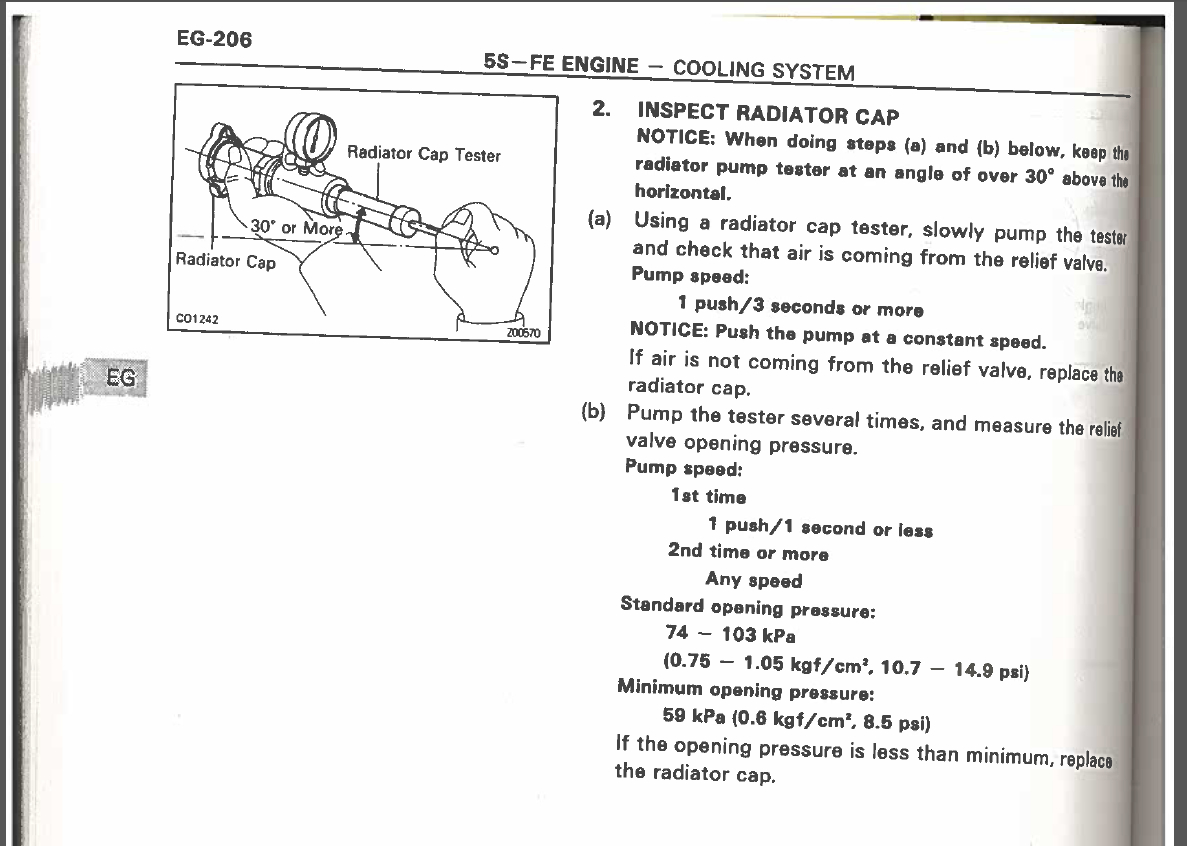 I pressure tested my cooling system it was perfectly fine. I got and tested several caps both new and used, and pressure tested them according to the OEM repair manual. Strangely, several OEM Toyota