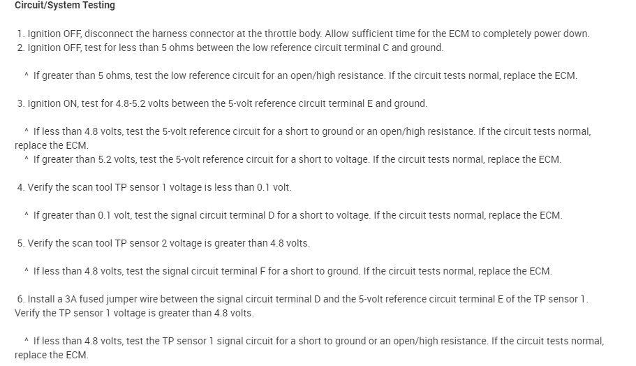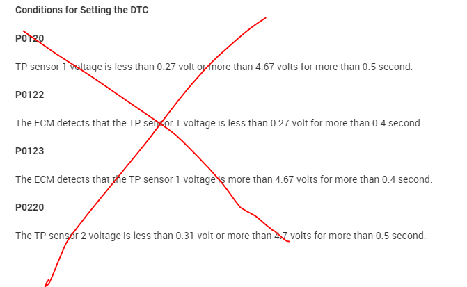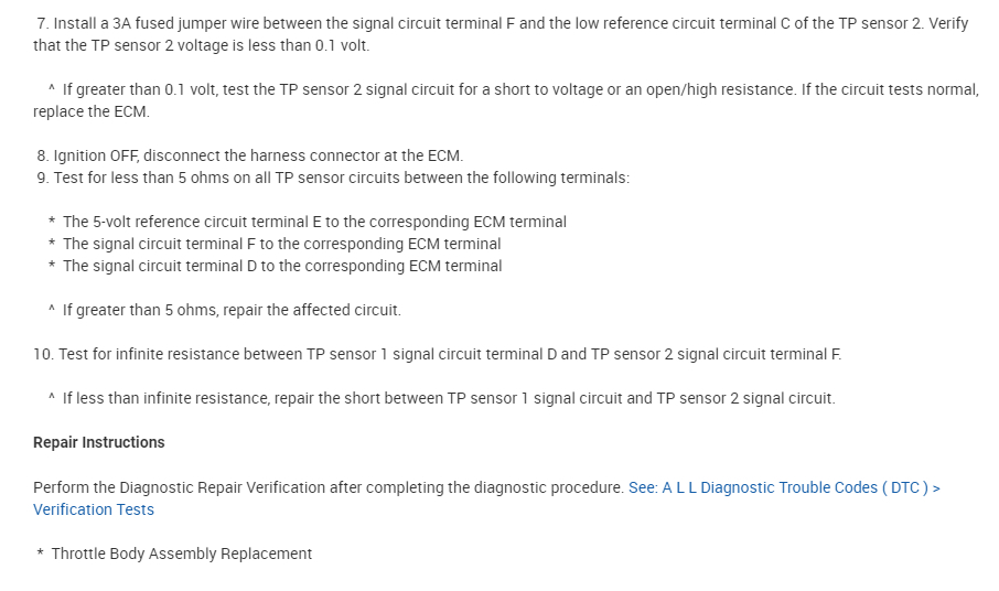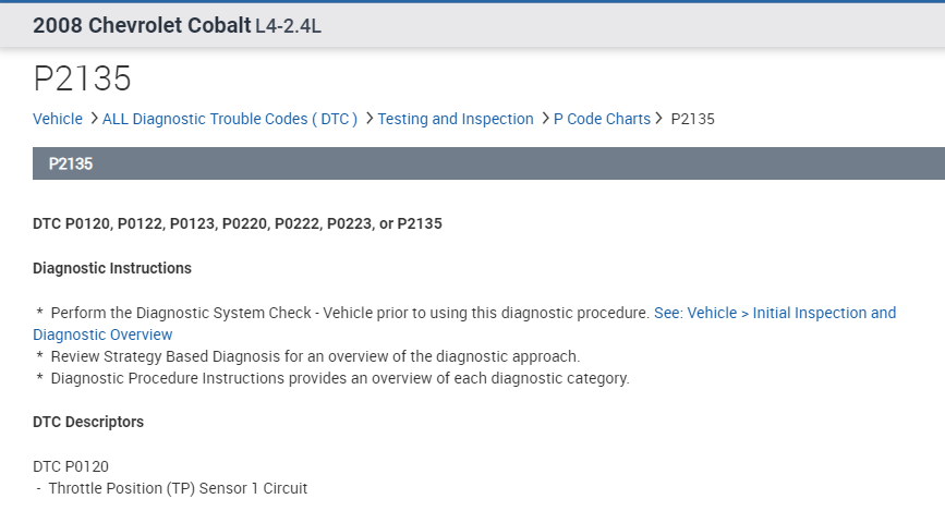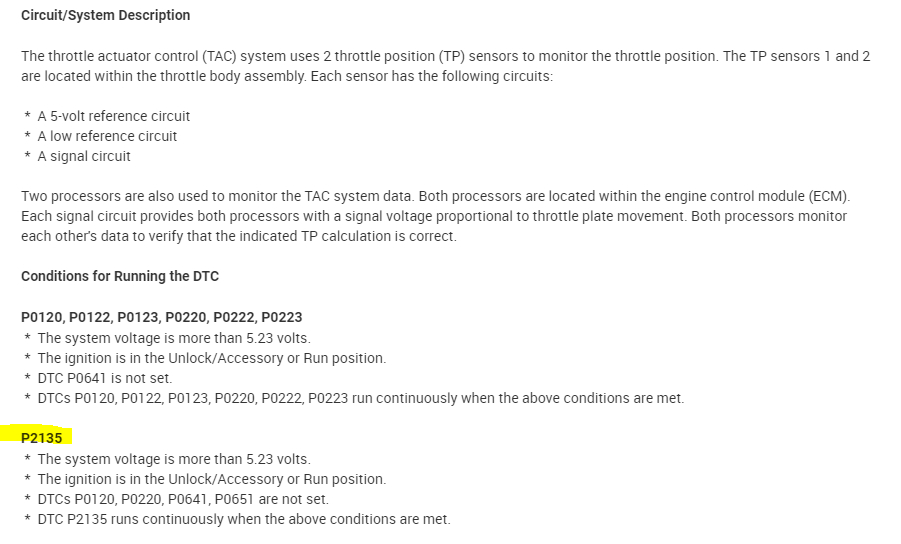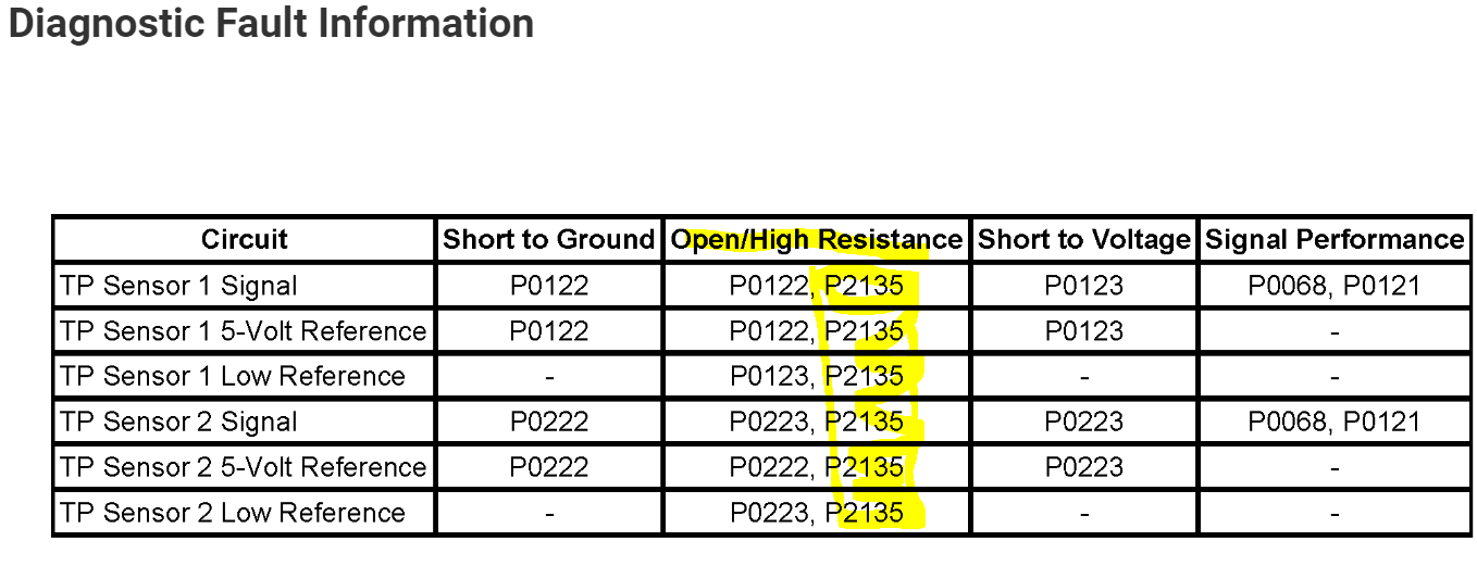 I attached the diagnostics below for the P2135. This is where I would start simply because it deals with an open circuit, and the other code shows a variation in voltages between throttle position sensors 1 and 2.