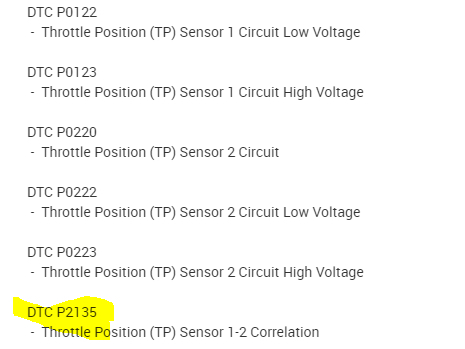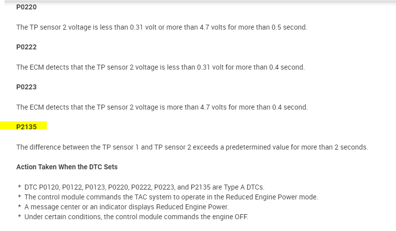 The codes are related to the throttle position actuators. When the P2135 is set, a message indicator should indicate, Reduced Engine Power.