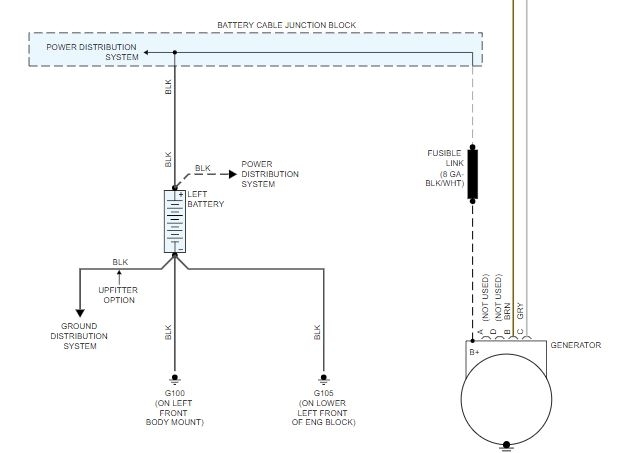 If the fuses are good, you need to check what is called a fusible link. It will appear to be a regular wire, but it functions as a fuse and can burn out. It is what allows power between the battery and the alternator. Take a look at picture 2. You need to locate the black/white wire that runs from the B+ pin on the alternator and battery cable junction block and check it for continuity. When doing this, disconnect the battery so no power is available to the wire.