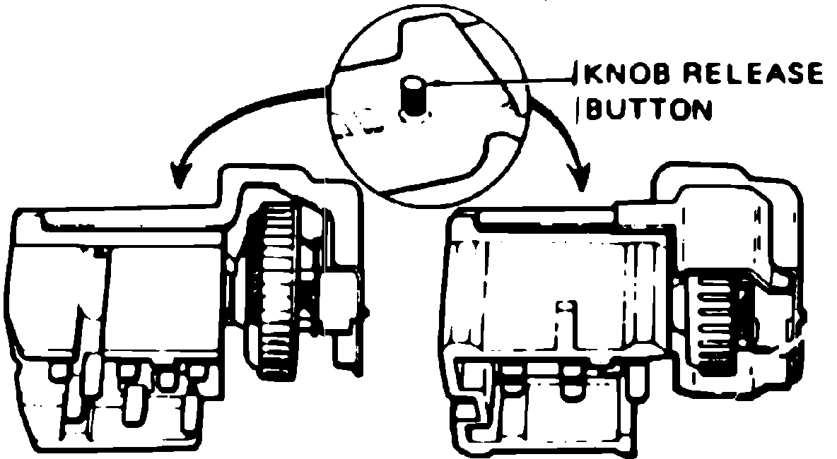 2. Under instrument panel, depress light switch knob and shaft retainer button on side of switch and, while holding button in, pull knob and shaft assembly from switch.