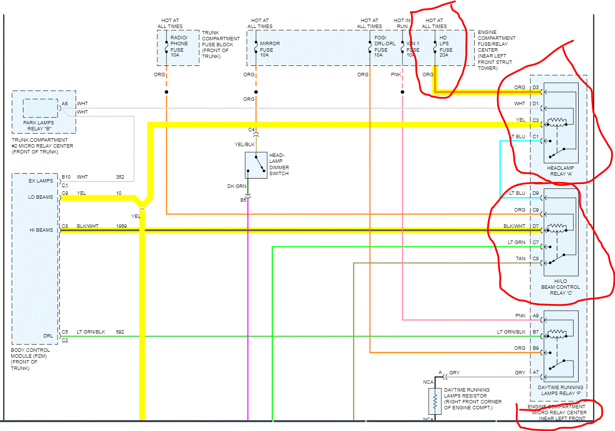 Next, I have attached a portion of the wiring schematic relating to the headlamps. First confirm the headlamp fuse itself is good and there is power to it.