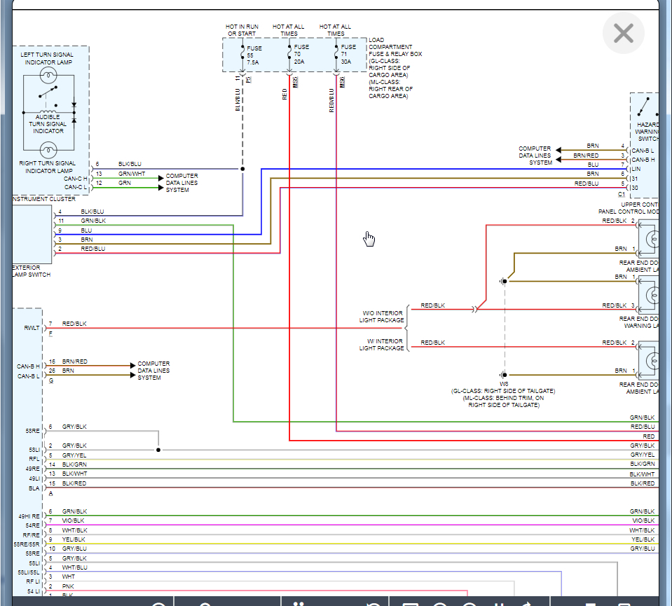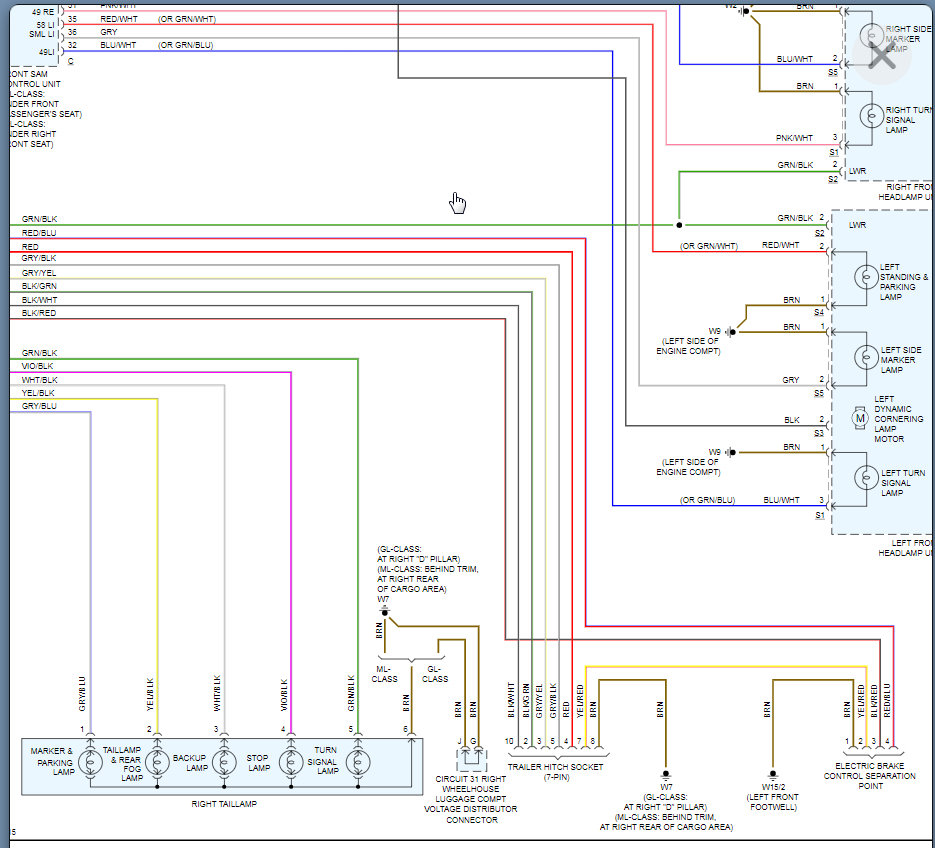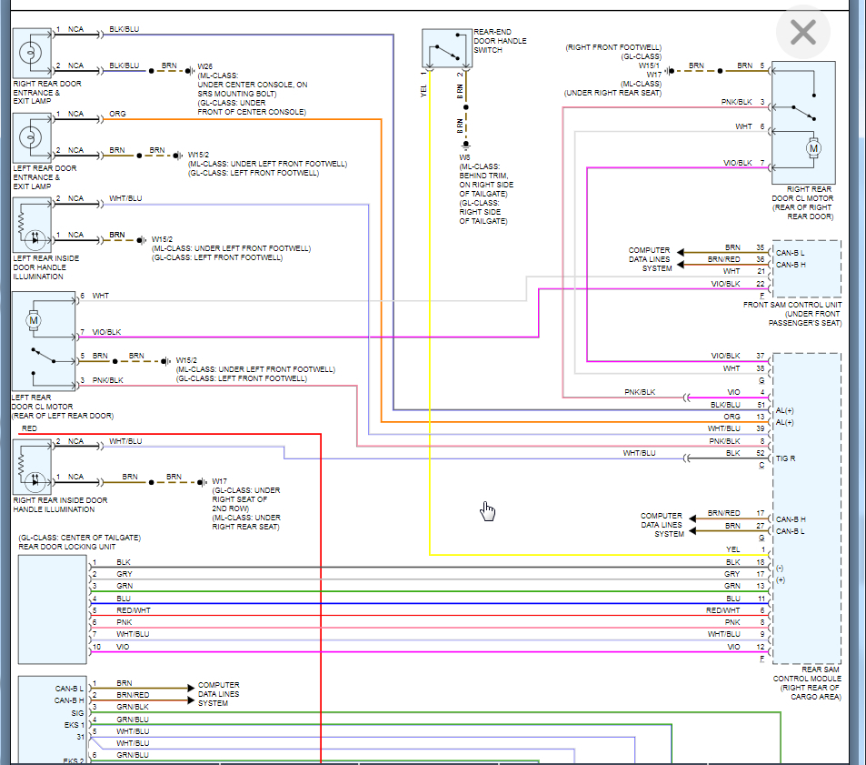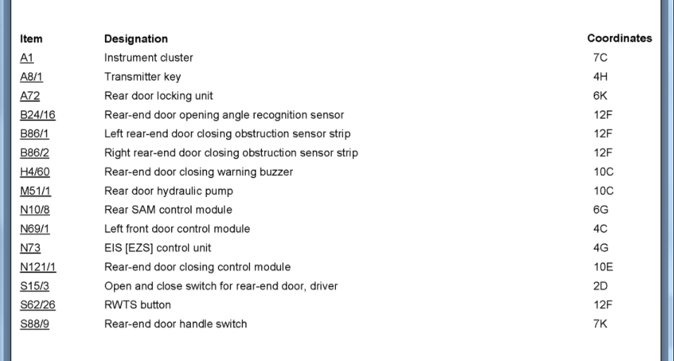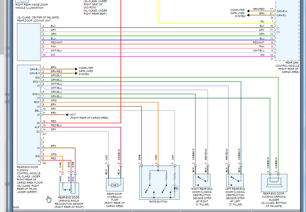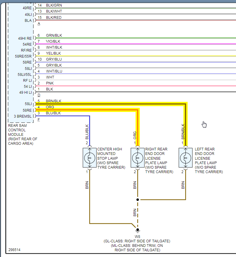 Rear SAM had corrosion issues. It was "fixed" - cleaned up. For the most part seems to be working fine but had a battery drain issue - draining overnight. Determined to be F connector on rear SAM, a relay inside kept clicking on and off every 30 seconds. Disconnecting connector F resolved the relay click and battery drain. Ultimately found to be the tailgate latch to be the cause. A new latch was installed and battery drain resolved. However, the latch does not "pull in" and lock properly. Also, license plate lights are out (bulbs are fine, wiring is fine). The wiring was checked at the hinge and everything is good. I suspect SAM internal fault. Looking for either advice or wiring diagram for rear SAM pinout to test output signals to latch and license plate lights.