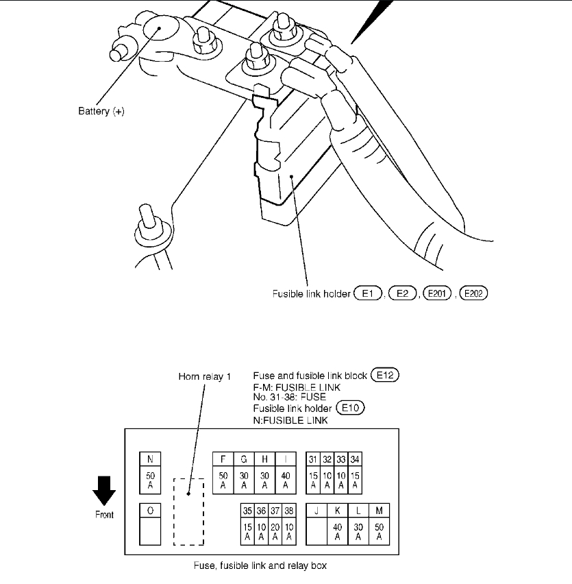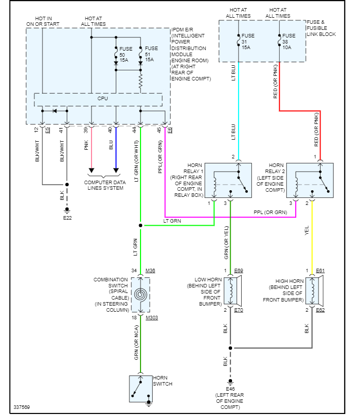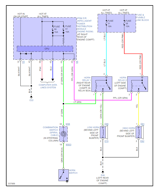 Let's start by checking the fuses because the IPDM controls the horn operation, and it can be having a feedback issue. Please check fuse # 50 and #51 in the fuse panel in the right rear of the engine compartment and fuse #31 and 38 in the fuse link box.