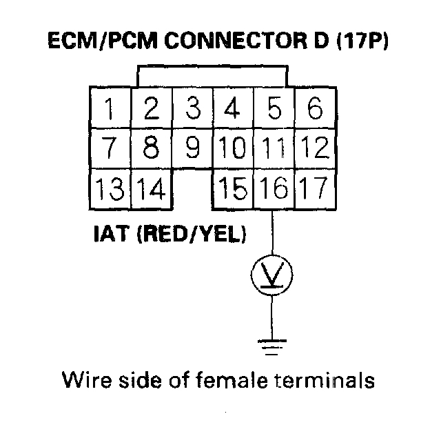 11. Measure voltage between IAT sensor 2P connector terminal No.1 and body ground.