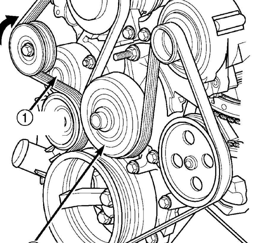 Now remove the drive belt from the water pump pulley (2) by using the tensioner to release it.