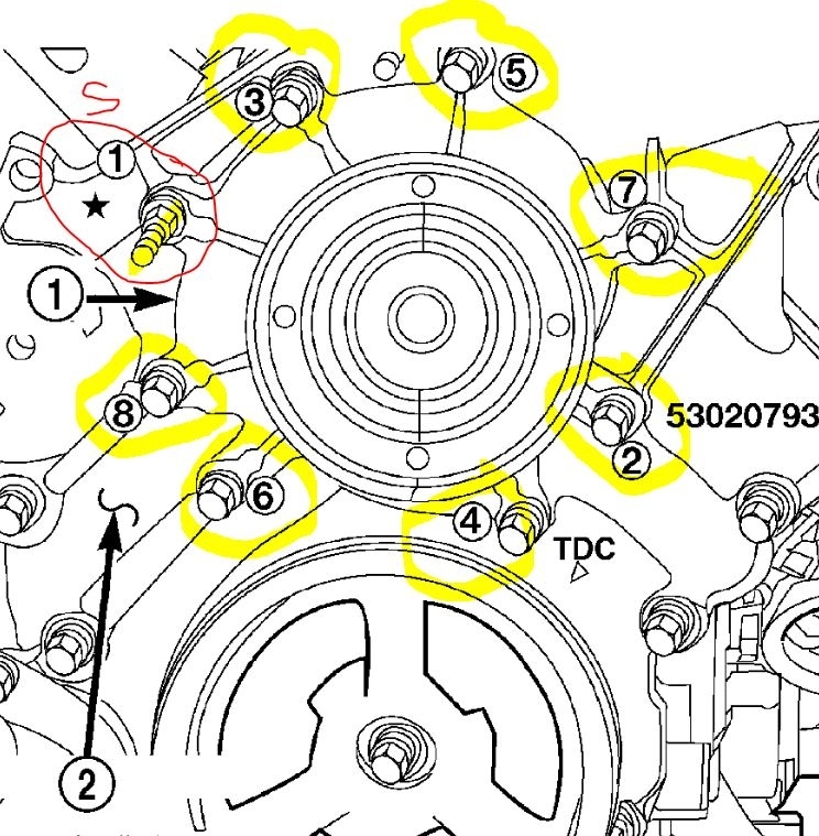 To install the replacement you reverse the process and use the pattern shown to tighten the bolts down to 43 foot pounds. The red circle is where the stud goes. Both engines use the same pump and this is one area I tend to go with aftermarket because the OE pumps use a plastic impeller, Gates makes a replacement 43263M with a metal impeller that seems to hold up better.