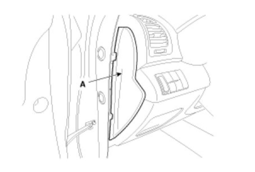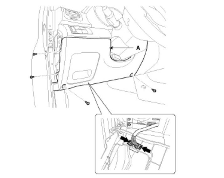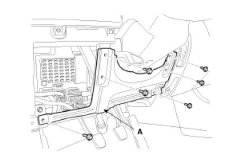 3. After loosening the crash pad lower panel mounting screws, remove the lower panel (A).