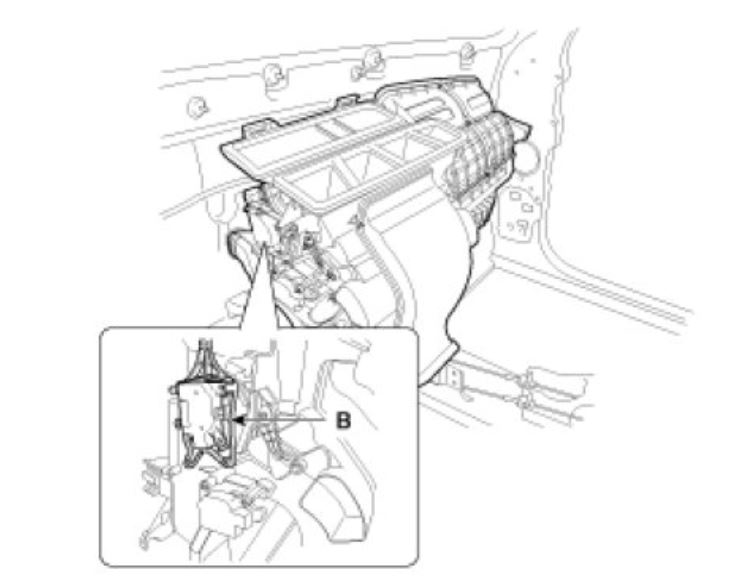 6. Loosen the mounting screws and then remove the mode control actuator (B).
