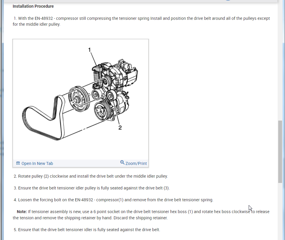 Install the EN 48932 compressor (1) to the drive belt tensioner spring.