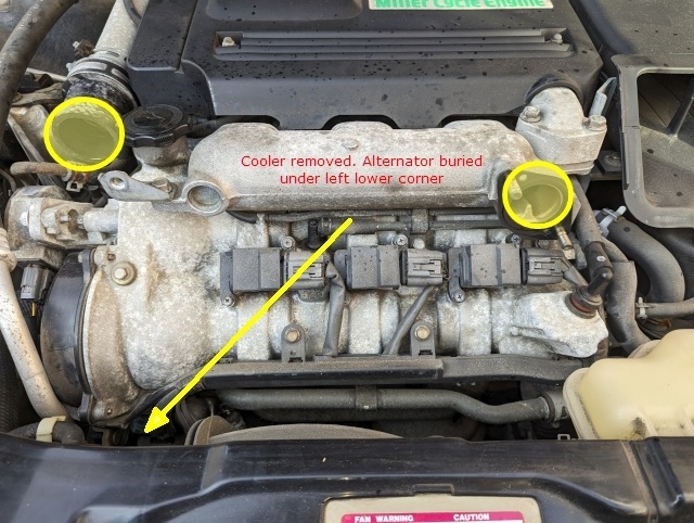 The vehicle listed above is an S (supercharged) Battery is good, but the charging system light is on. Tested voltage at battery posts while running, and it was below 13, so it looks like battery isn't charging. I had to remove the charge air cooler to access the connector plug and post from the top. I want to test voltage from the post, before assuming the alternator is toast, but can I safely run the engine with the air cooler removed? Can't access the buried alternator with the cooler in place.