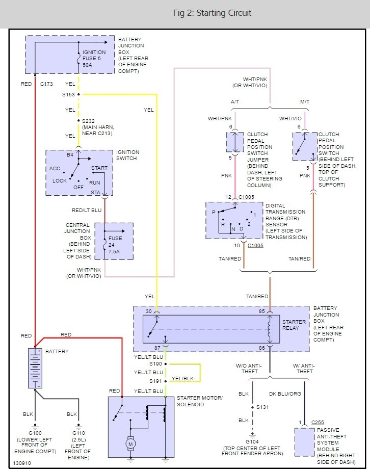I would look at all if the fuses and test the starter relay, here are a couple guides and a diagram to hep you do some testing and get the problem fixed.