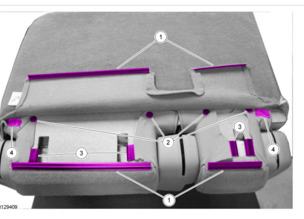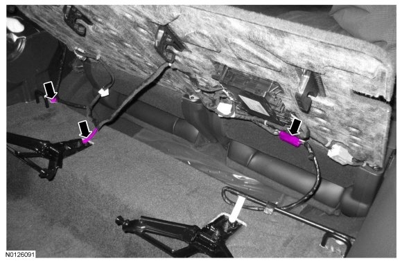 1. Remove the LH and RH quarter trim panels. REFER to Trim Panel, Quarter Trim Panel - Without Inflatable Safety Belts or REFER to Trim Panel, Quarter Trim Panel - With Inflatable Safety Belts .
