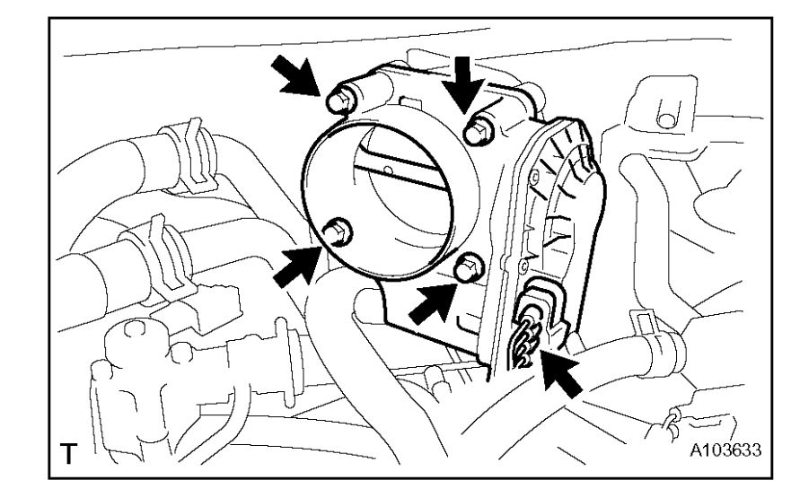 b. Remove the 4 bolts and disconnect the throttle body from the intake air surge tank.