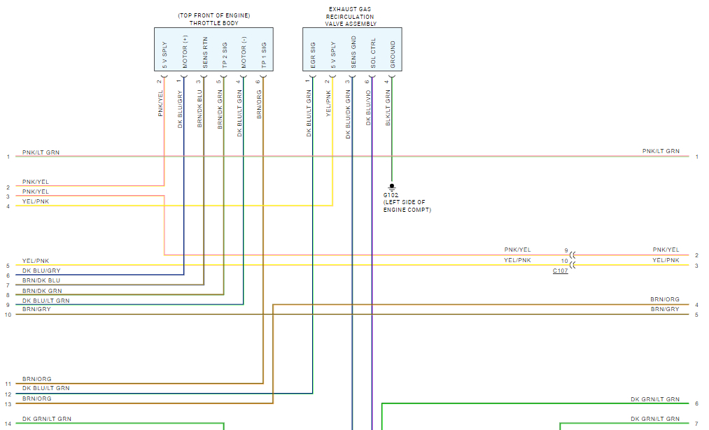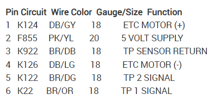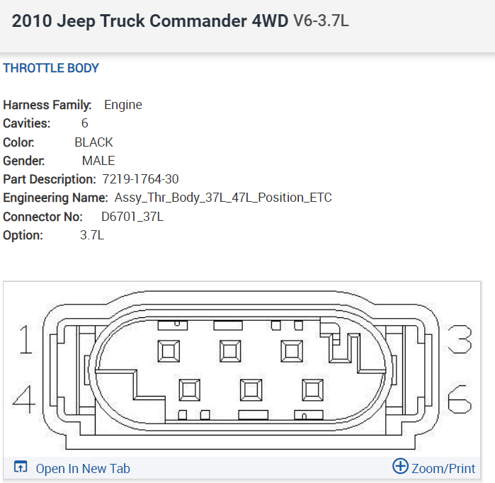 I'm having an issue with the throttle on the vehicle listed above; the wiring to the Throttle body was changed and I'm not sure that the connections were spliced correctly. The problem I'm having is the Lightning bolt symbol is on the cluster, scanning the system shows TP sensor 2 has no signal change when depressing the throttle and the vehicle goes into limp mode. I have replaced the throttle body with a new part with the same result. I have looked at the diagram from the OEM service manual, it shows that the 3.7L engine does not have the style of Throttle body that is on this vehicle, it shows that this style was used on the 5.7L version. Could someone advise me as to the proper wiring schematic for the 6-pin connector at the throttle body, showing the circuit numbers. I have done a pin out test from the connector back to the ECM all wiring tests okay, but I'm not sure if the pins are in the correct position on the connector.