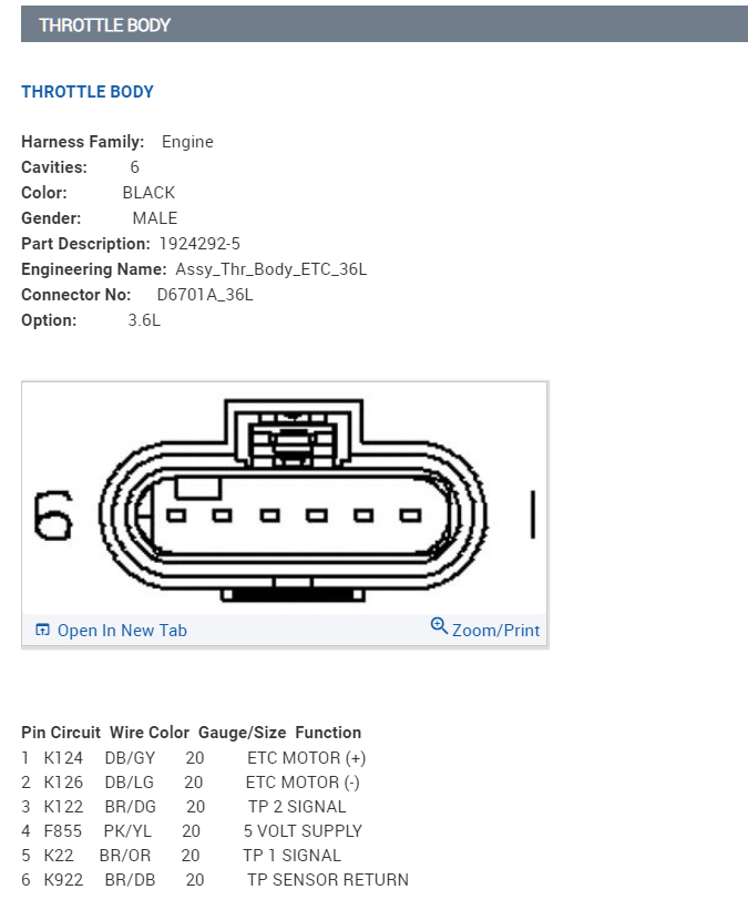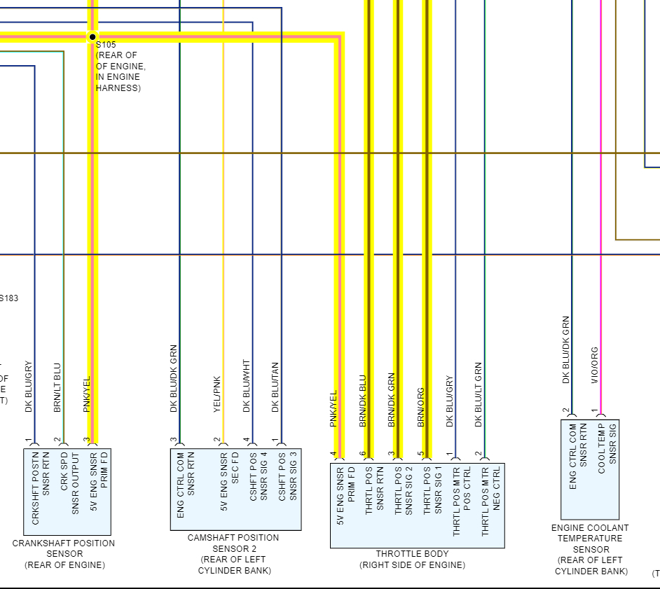 For the Throttle Body, there is one 5-volt Reference Feed, two Signal wires TP1 and TP2, and one TP sensor Return (Ground). The first diagram is the throttle body pinout. Since you actually got a TPS code, checking the throttle body first would be recommended. If you unplug the 6-wire connector on the throttle body, turn the key to just the "on" position, engine off. Using a basic multimeter, put the red lead on the pink/yellow wire and the other lead on the brown/dark blue wire, you should read 5-volts. But if you can give us the actual codes it would be faster so we can test the correct circuit without going through all the others.