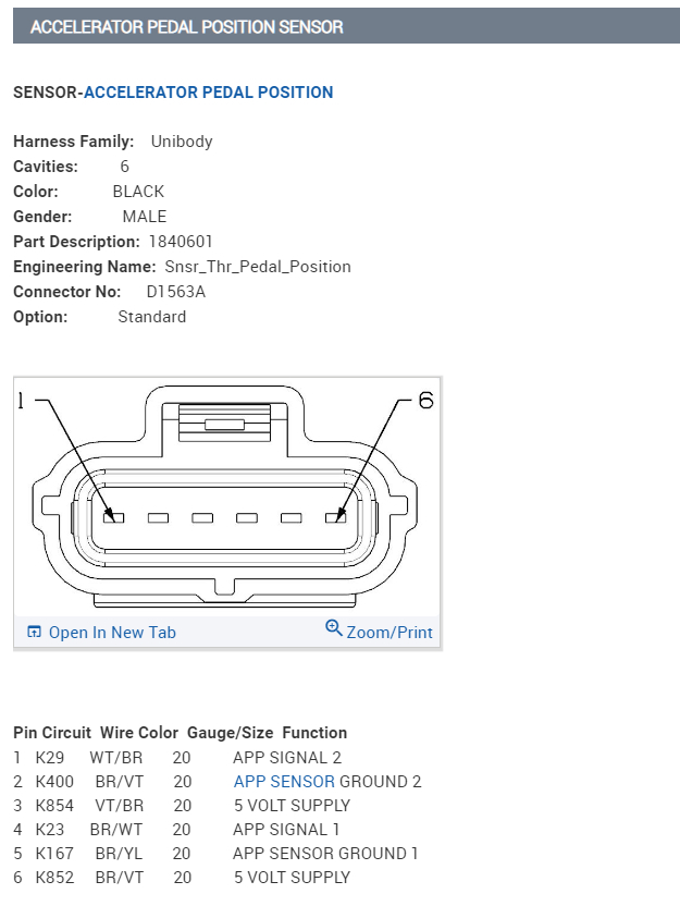 For the Accelerator Pedal Position sensor, even though you replaced the sensor, you need to check that the sensor is receiving its Reference Voltage, Ground and Signal wires. If the Reference Voltage is low, the Signal will be low too. Here is a pinout to the sensor. It's a double APP sensor. So, it has two 5-volt Reference wires, two Grounds, and two Signal wires going to the ECM. This is known as a Drive By wire system. The ECM controls the throttle plates and throttle body. The APP sensor is an Input to the ECM. So, you can unplug the sensor on the pedal, and with the Key On, engine off, as you can see from the diagram pins 3 and 6 are the 5-volt Ref. So, if you take a basic multimeter and on a voltage setting, put the red lead on pin 3 and the black lead on pin 2 (which is the sensor ground) you should read 5-volts. Do the same with pins 6 and 5 should also read 5-volts.