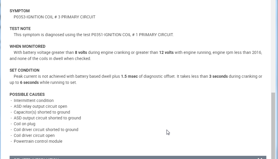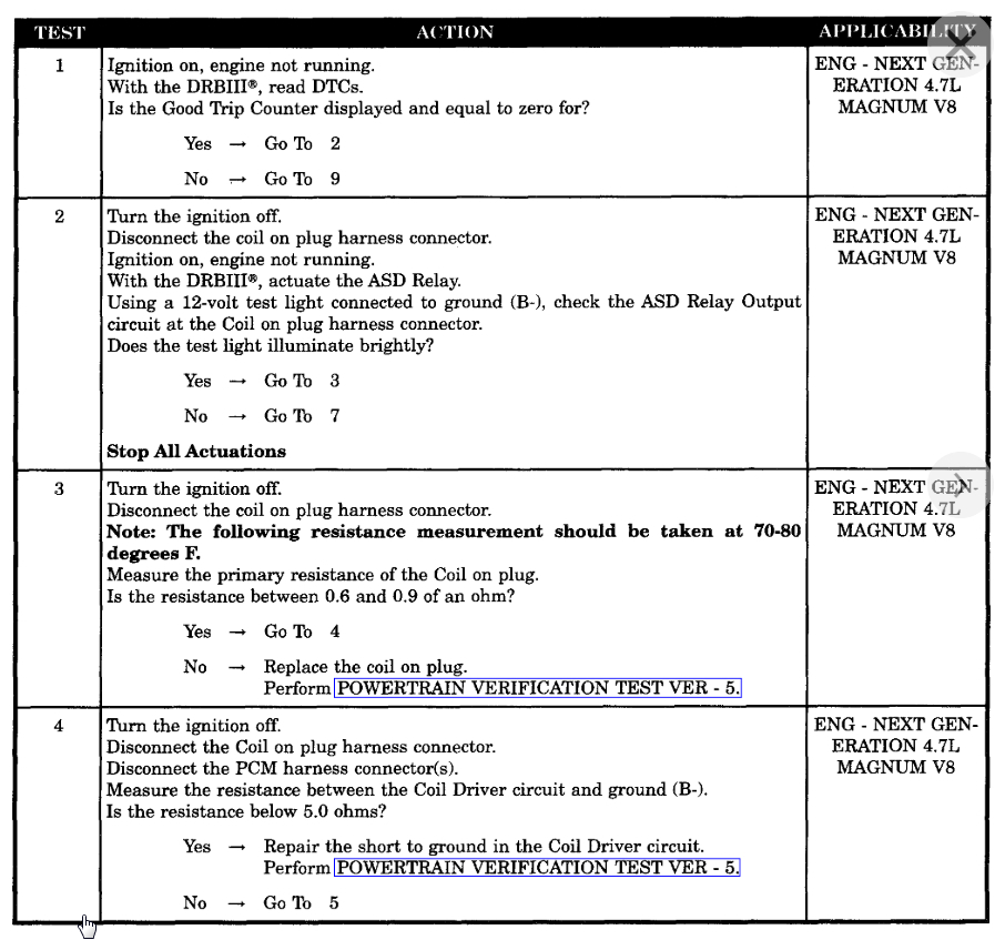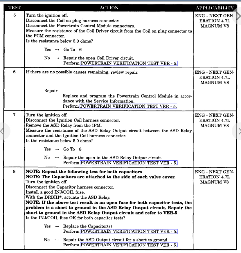 The P0303 and 0306 are just general misfire codes. Your codes are pointing specifically to the coil driver circuit. Unfortunately you need a scan tool that is capable of doing what the DRBIII does by actuating the relay. However, if you don't have that, just skip the step and go to the other testing and check the wiring. I suspect your issue is going to be a wiring issue to the COP or the PCM itself. If you look at the last page that I attached it shows you the possible causes and 5 of them are wiring issues and the other are the COP and PCM. So we need to run through the wiring testing portion of these steps.
