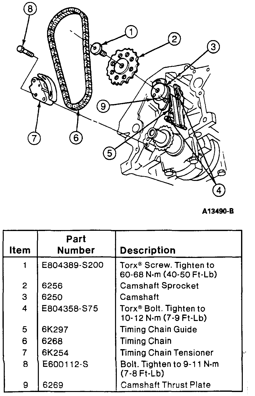5. Install the camshaft sprocket retaining bolt, and tighten to 60-68 Nm (44-50 ft lb).