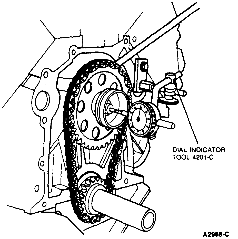 a. Push camshaft toward rear of engine. Install Dial Indicator TOOL-4201-C or equivalent so indicator point is on camshaft sprocket attaching screw.