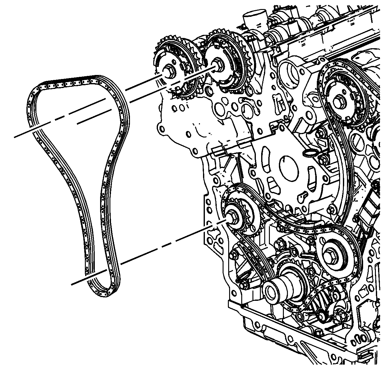 6. Install the primary camshaft timing chain. Refer to Primary Camshaft Intermediate Drive Chain Installation (See: Engine > Overhaul).