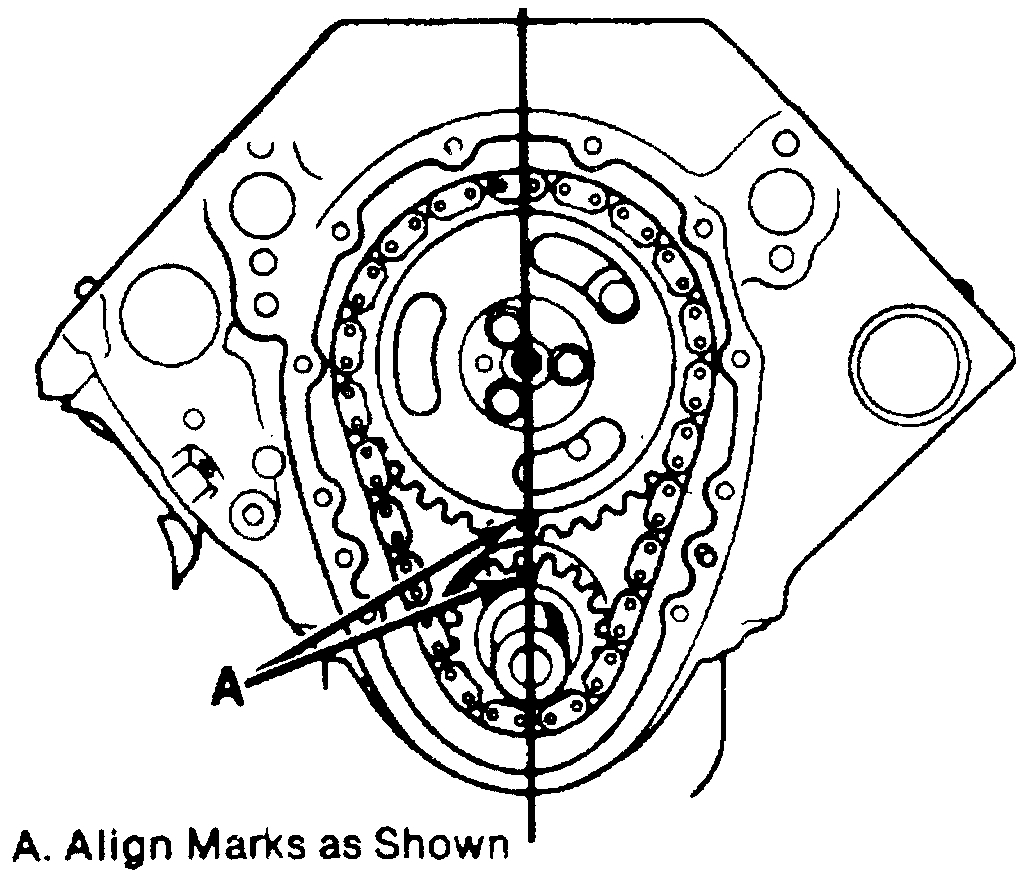 7. Install chain onto camshaft sprocket. Hold sprocket with chain hanging vertically, then align marks on sprockets as shown, Fig. 8. The valve timing marks shown in Fig. 8 do not indicate TDC compression stroke for No. 1 cylinder, which is used during distributor installation. If distributor was removed, install timing chain and sprockets, aligning timing marks, Fig. 8, then rotate engine until No. 1 cylinder is on compression and camshaft timing mark is 180 degrees from valve timing position shown in Fig. 8.