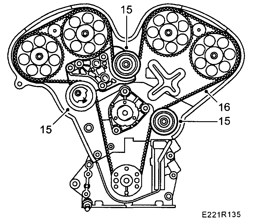 16. Mark the direction of rotation on the belt. The belt can also be marked with the respective camshaft markings and crankshaft marking to facilitate refitting. Remove tool KM-800-10 from the crankshaft. Let locking tools KM-800-1 and KM-800-2 remain. Remove the lower adjusting roller. Ensure the washer behind the roller is also removed. Remove the timing belt.