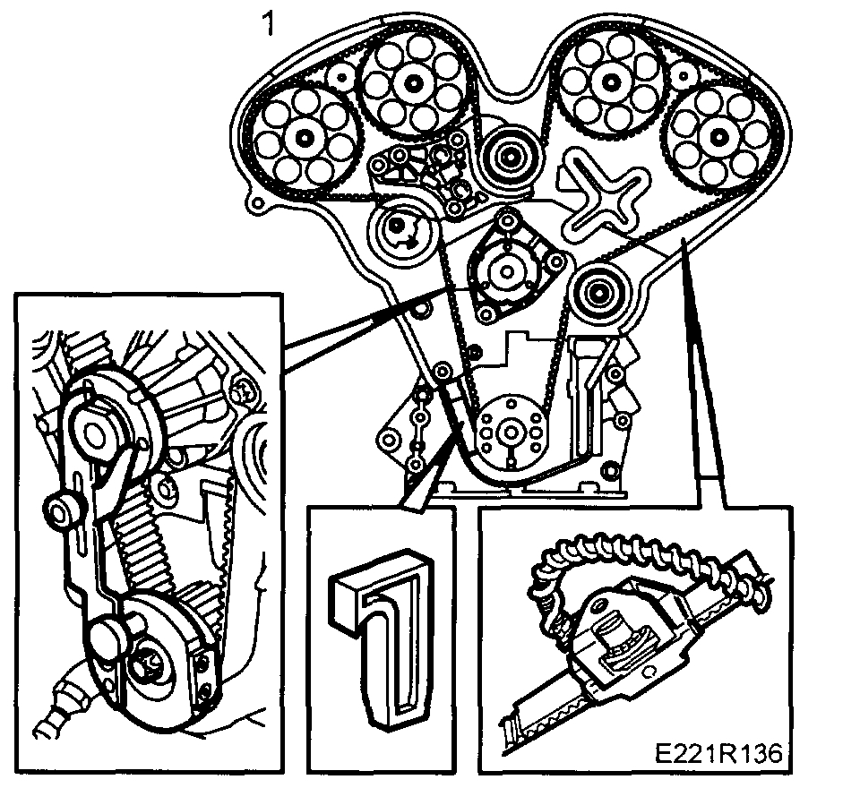 14. Zero the engine. The markings on the camshaft sprockets and the timing cover must be aligned, use Installation tool for camshaft scrod KM-800-20, as must the crankshaft marking. Fit the locking tool KM-800-1 and KM-800-2 for the camshaft sprockets and locking tool KM-800-10 for the crankshaft.