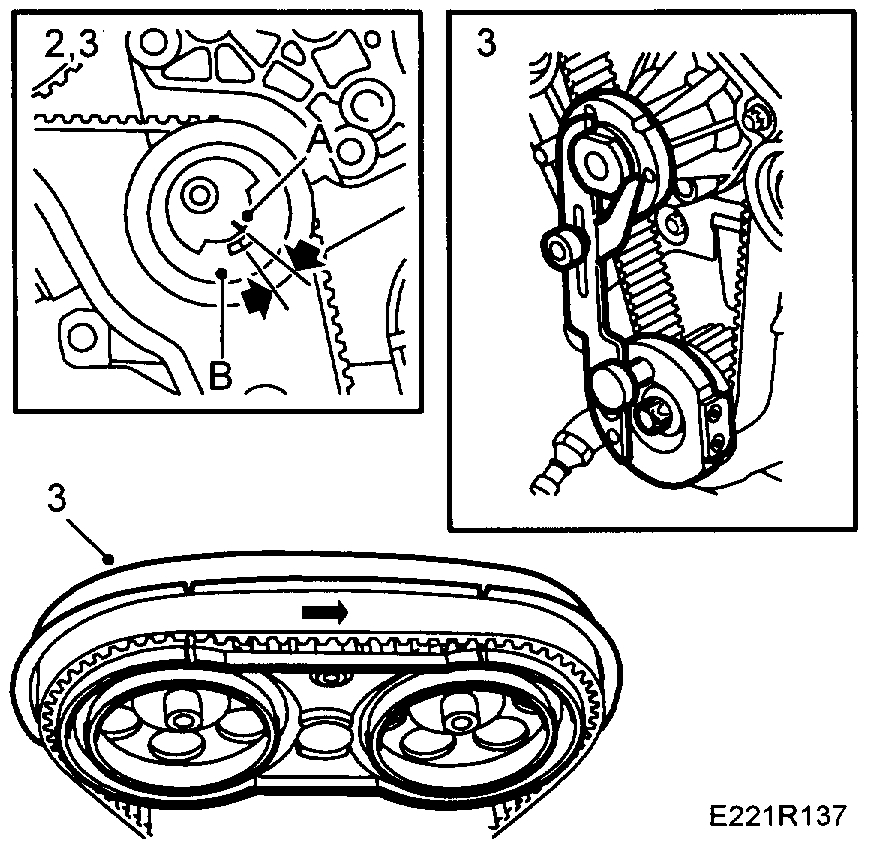 1. Put on the camshaft belt according to the markings on the belt and the marked direction of rotation Use Installation tool for camshaft scrod KM-800-30 to keep the belt in place. Fit the lower tensioning pulley loosely. Make sure the washer is in place. Adjust the tensioning pulley by hand so that the belt does not jump. Adjust anti-clockwise. Make sure the markings on the camshaft belt and the corresponding markings on the camshaft sprocket and crankshaft are aligned. Remove the tool KM-800-30.