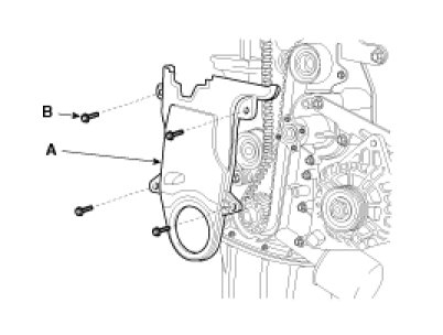 12. Remove the 4 bolts(B) and timing belt lower cover(A).