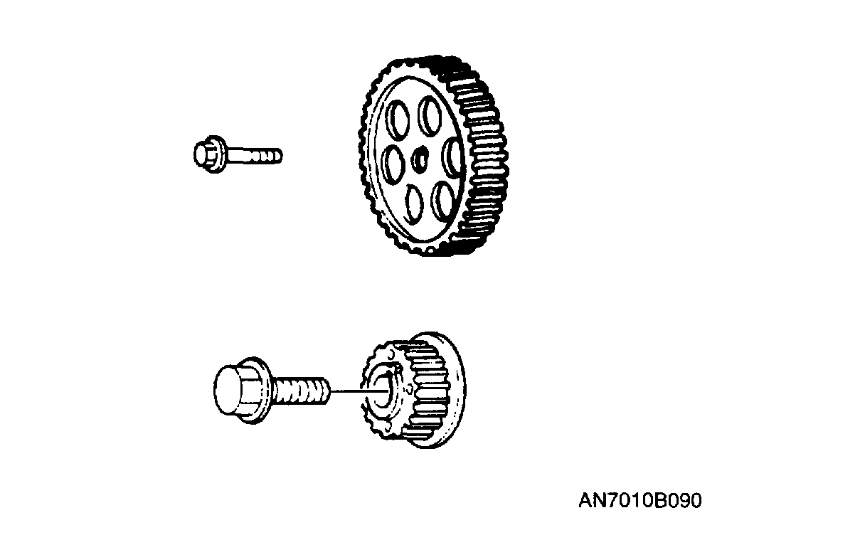 5. Inspect camshaft pulleys and timing belt pulley for broken teeth or damage.